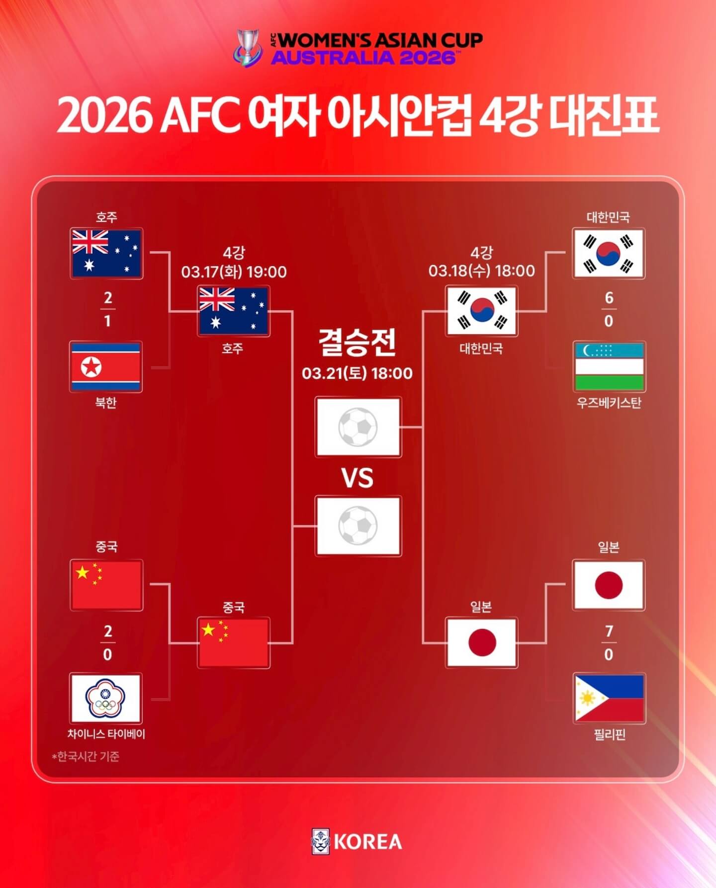 A1. 결승행 티켓이 걸린 운명의 맞대결은 한국 시간 기준 3월 18일 수요일 오후 6시에 정식으로 킥오프합니다.